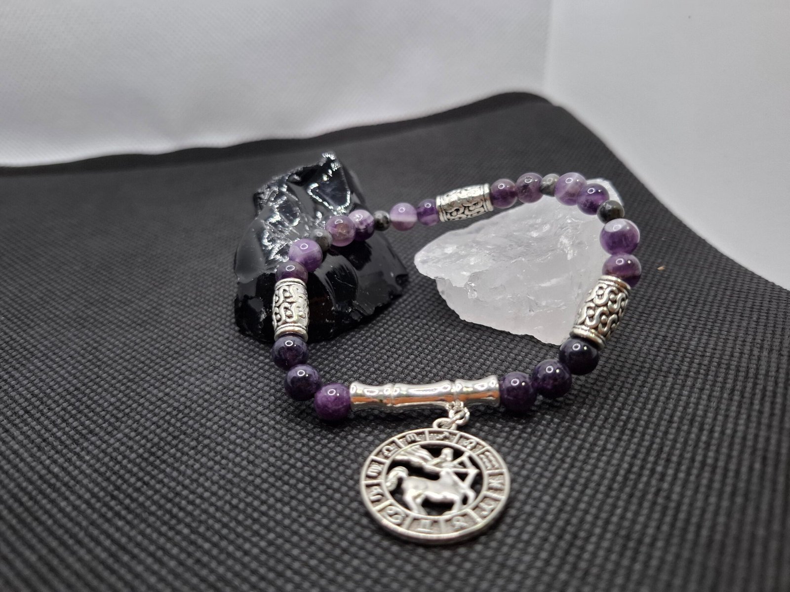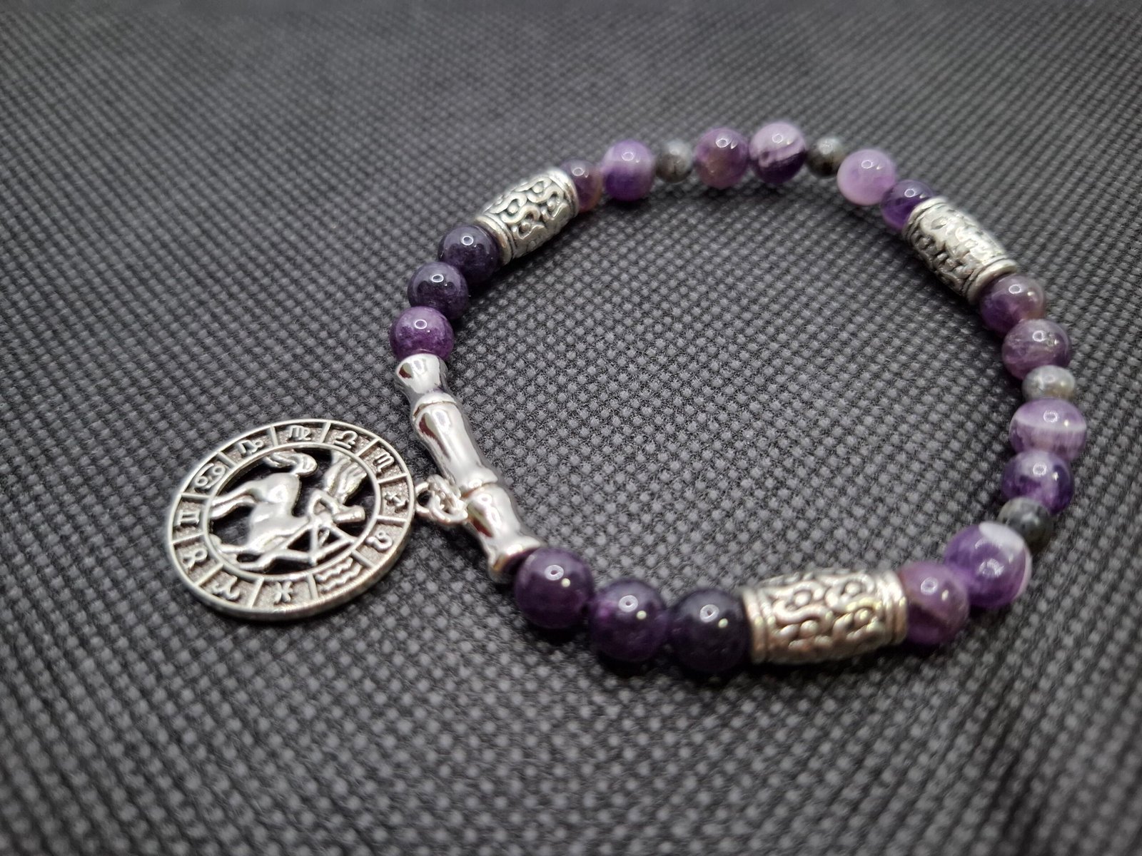 צמיד גולי נושא תליון של מזל קשת ומשלב אמטיסט עם לרוויקייט –חיבור בין חופש, אמת ועוגן פנימי.