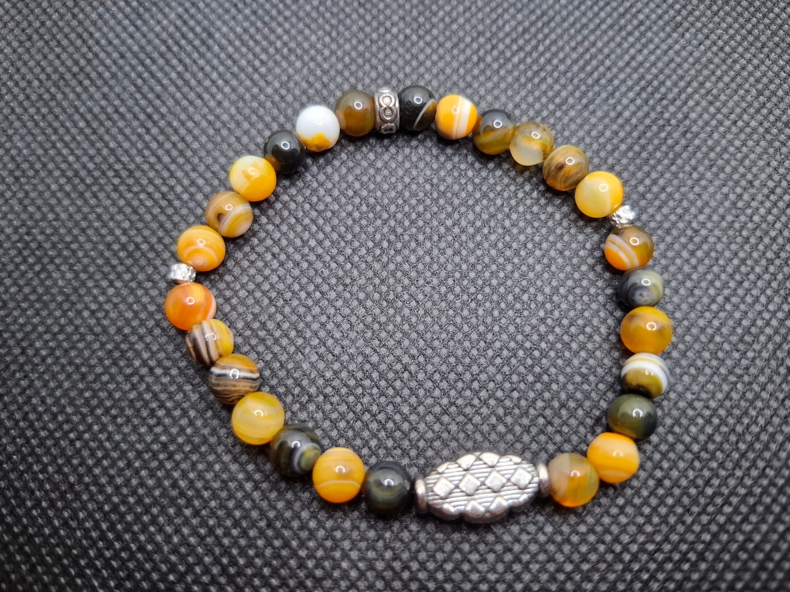 צמיד נוגה עשוי מאבן אגת במבלבי בגוונים חמים של צהוב, כתום ושחור, אבן שמביאה איתה אנרגיה של תעוזה, שמחת חיים ותנועה קדימה.