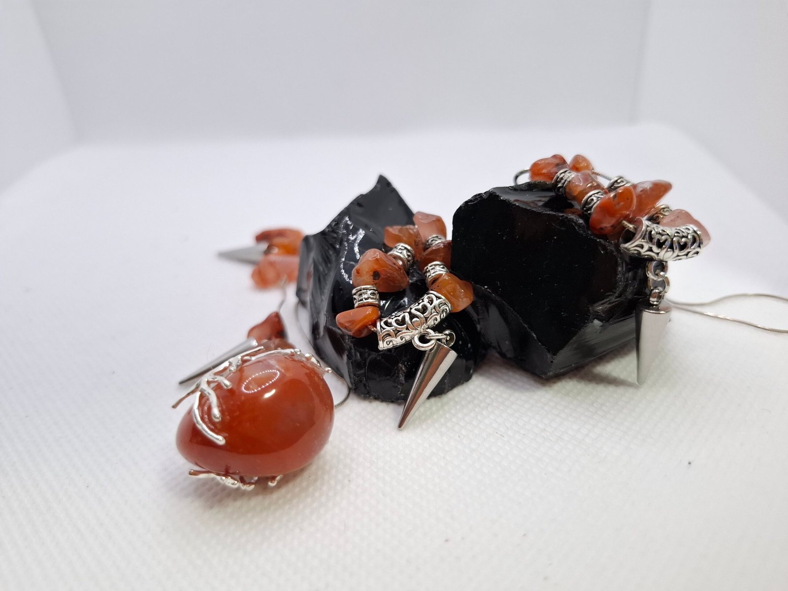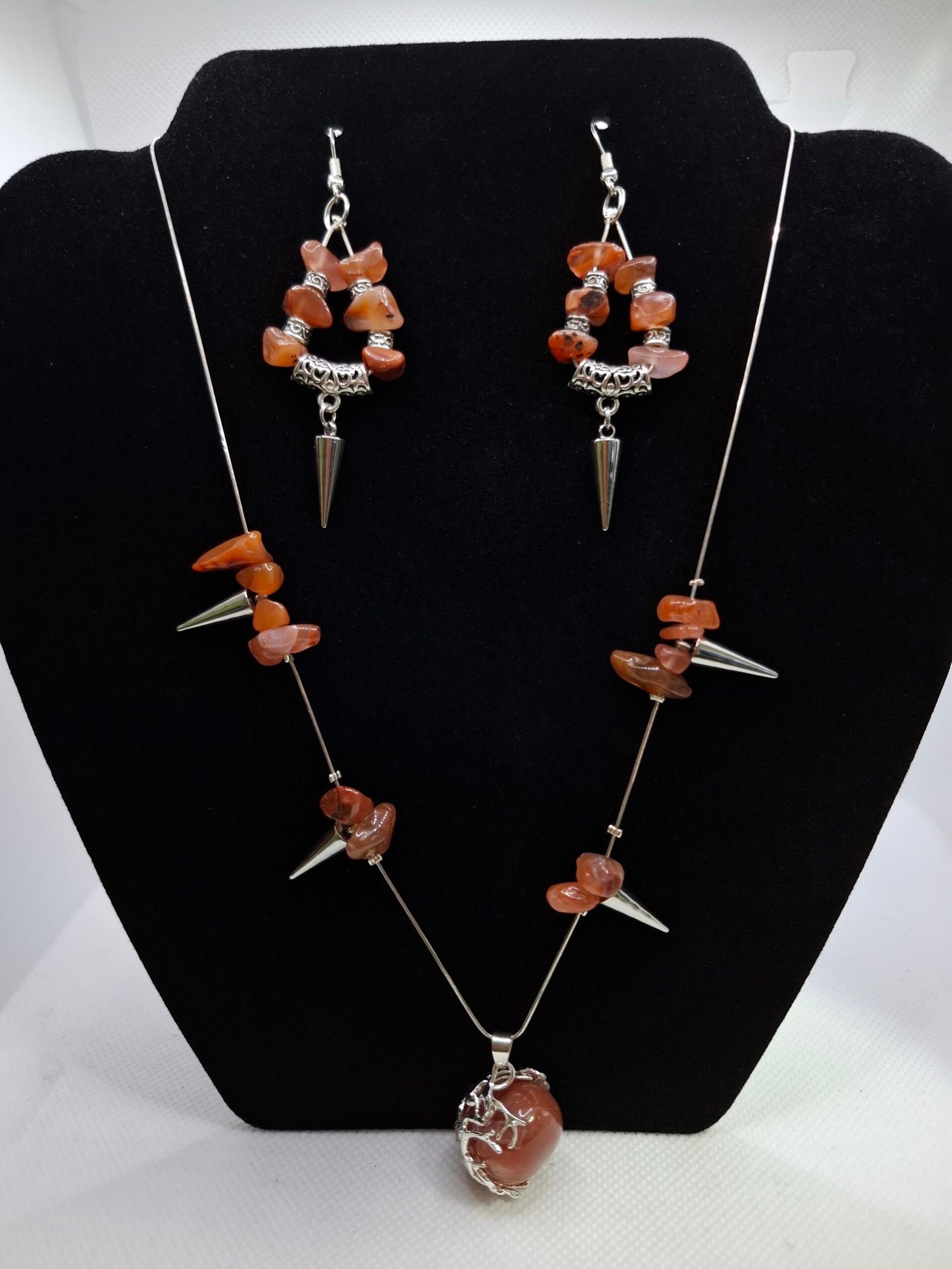 סט תכשיטים נועז ומלא אופי, משולב באבני קרנליאן טבעיות, אלמנטים כסופים חדים ותליון עגול מעוטר בעץ החיים.