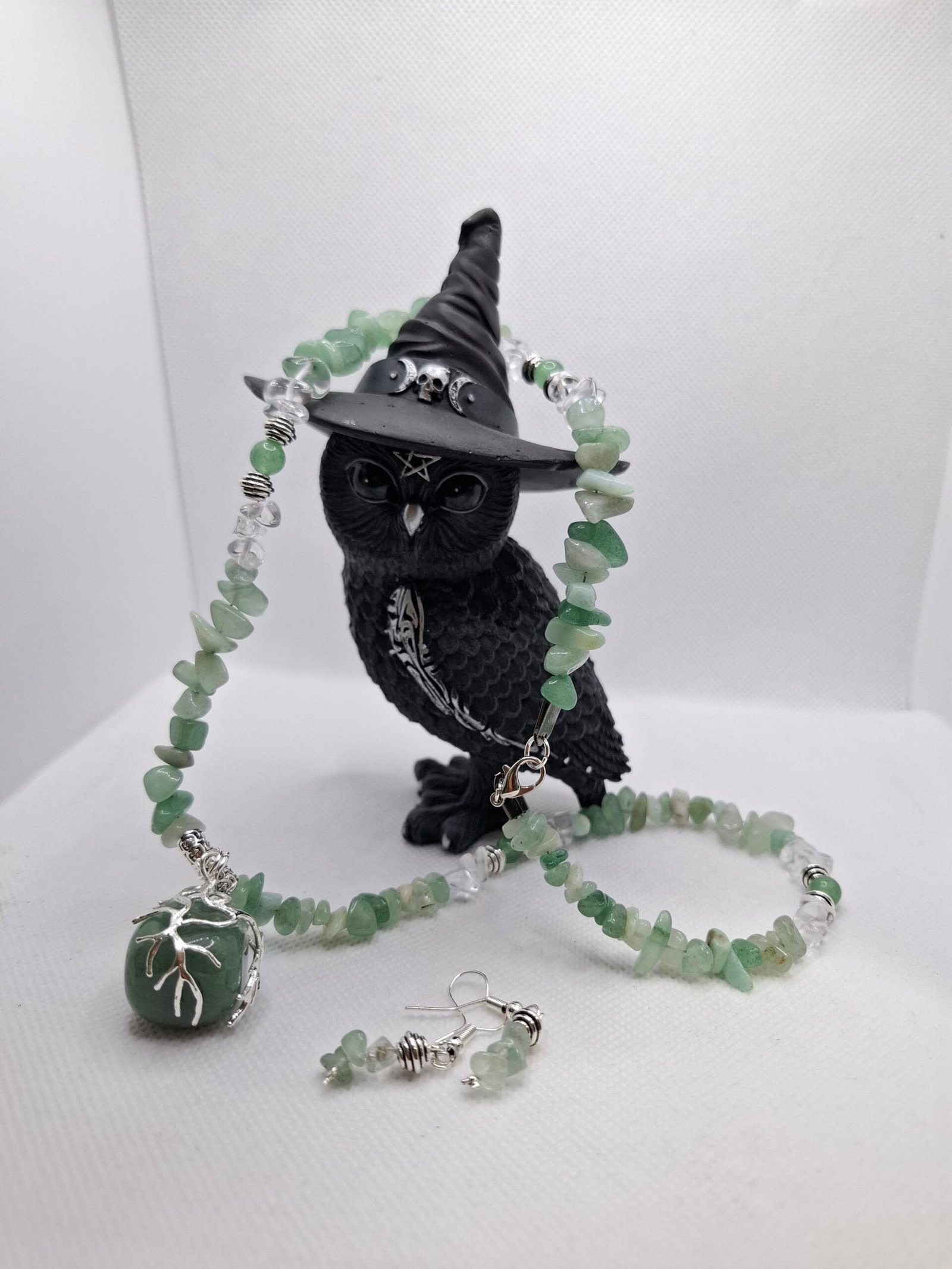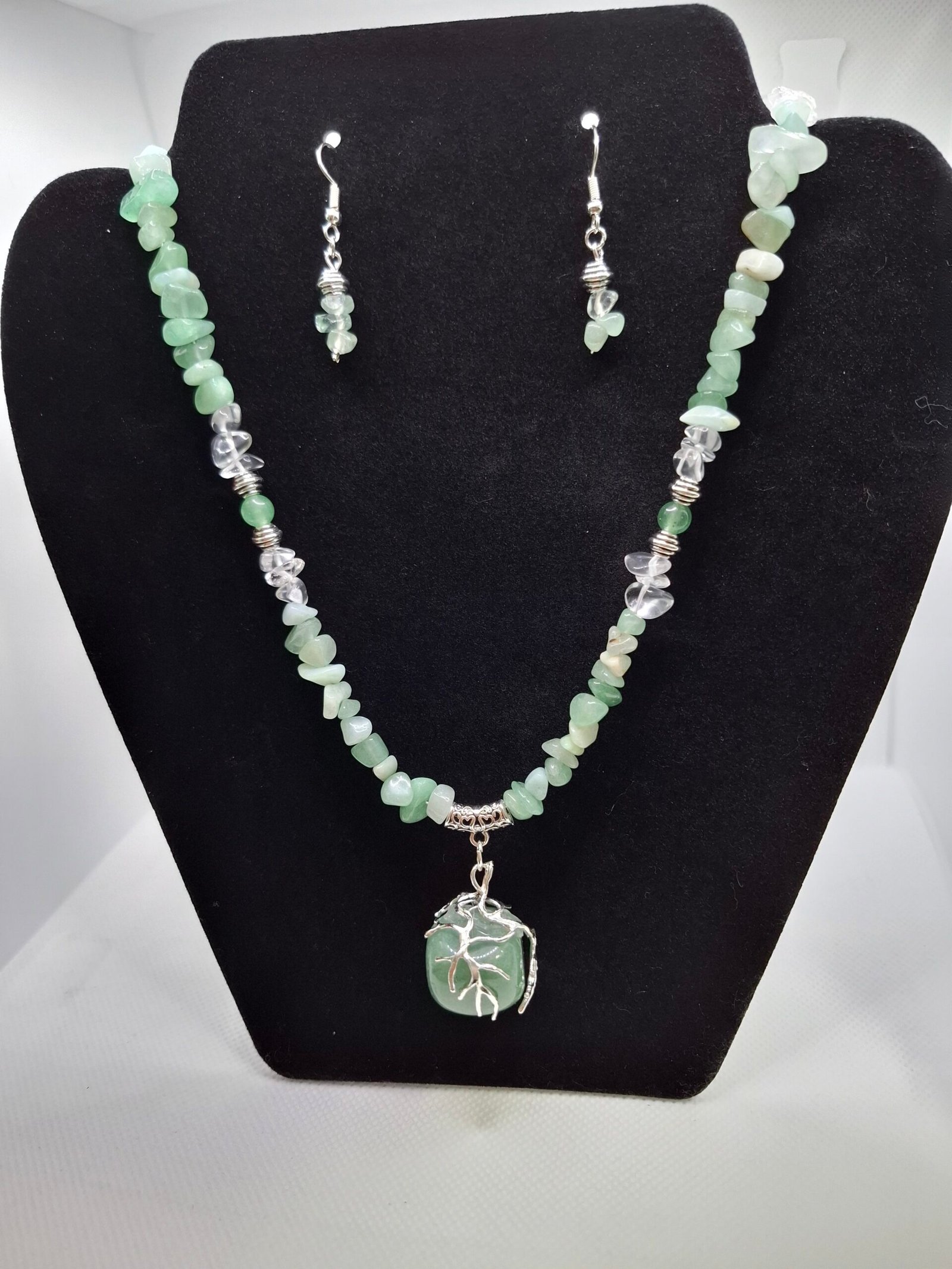 סט תכשיטים רך ומרגיע המשלב אבני אוונטרין בגוון ירוק בהיר ומרענן עם קוורץ שקוף לשקיפות פנימית והבהרה. הסט כולל שרשרת עם תליון ציפוי כסף מעוטר בעץ החיים, עגילים תואמים וצמיד אלסטי, שמשרים תחושת רוגע, חיבור פנימי ויופי טבעי.