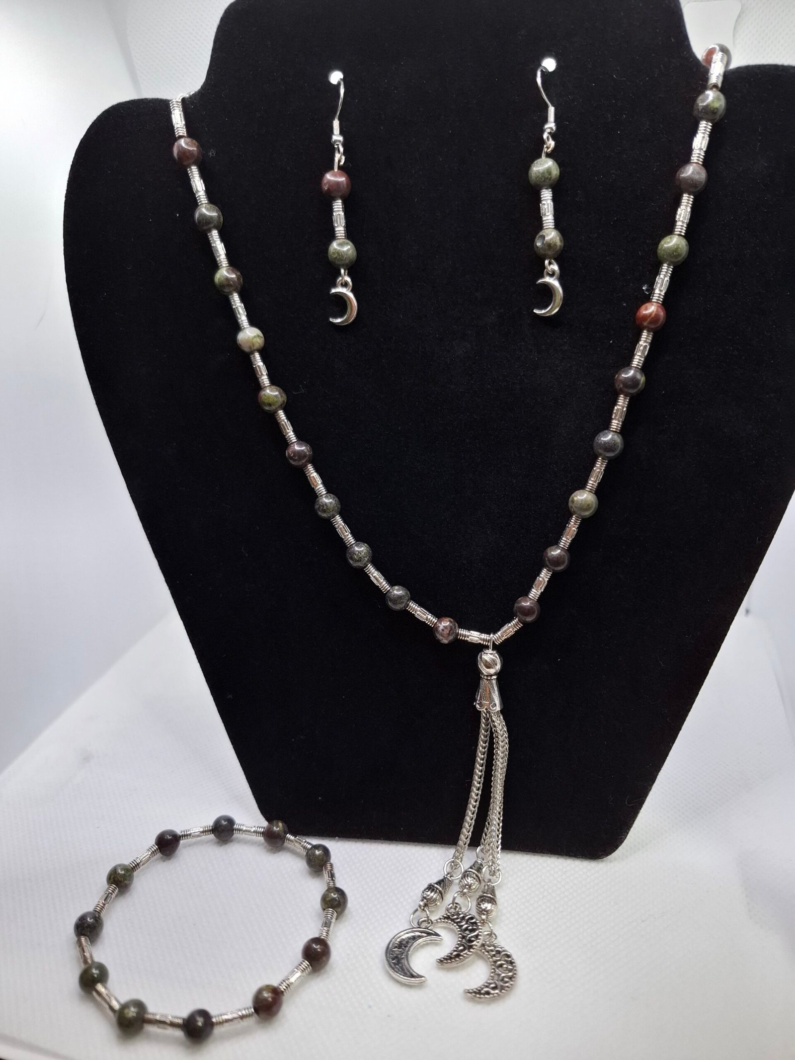 סט תכשיטים עוצמתי וייחודי המשלב ג׳ספר דם הדרקון בגווני ירוק–אדמדם עמוקים, אבן של כוח פנימי, חוסן והתחדשות. הסט כולל שרשרת אלגנטית עם תליון שרשראות וירחים כסופים, עגילים תואמים וצמיד משלים, היוצרים מראה בוהו־מיסטי עם נוכחות חזקה ואמירה.