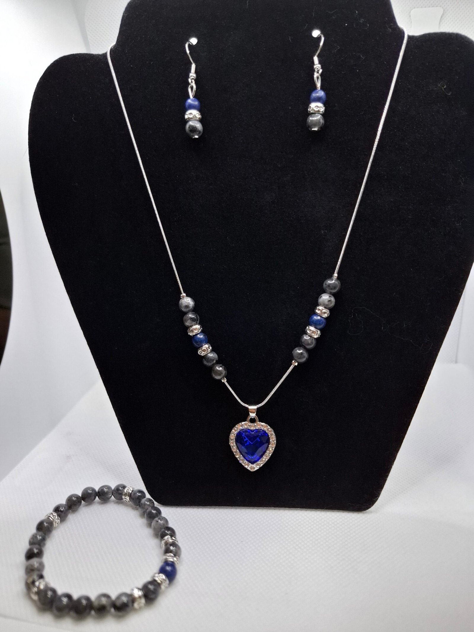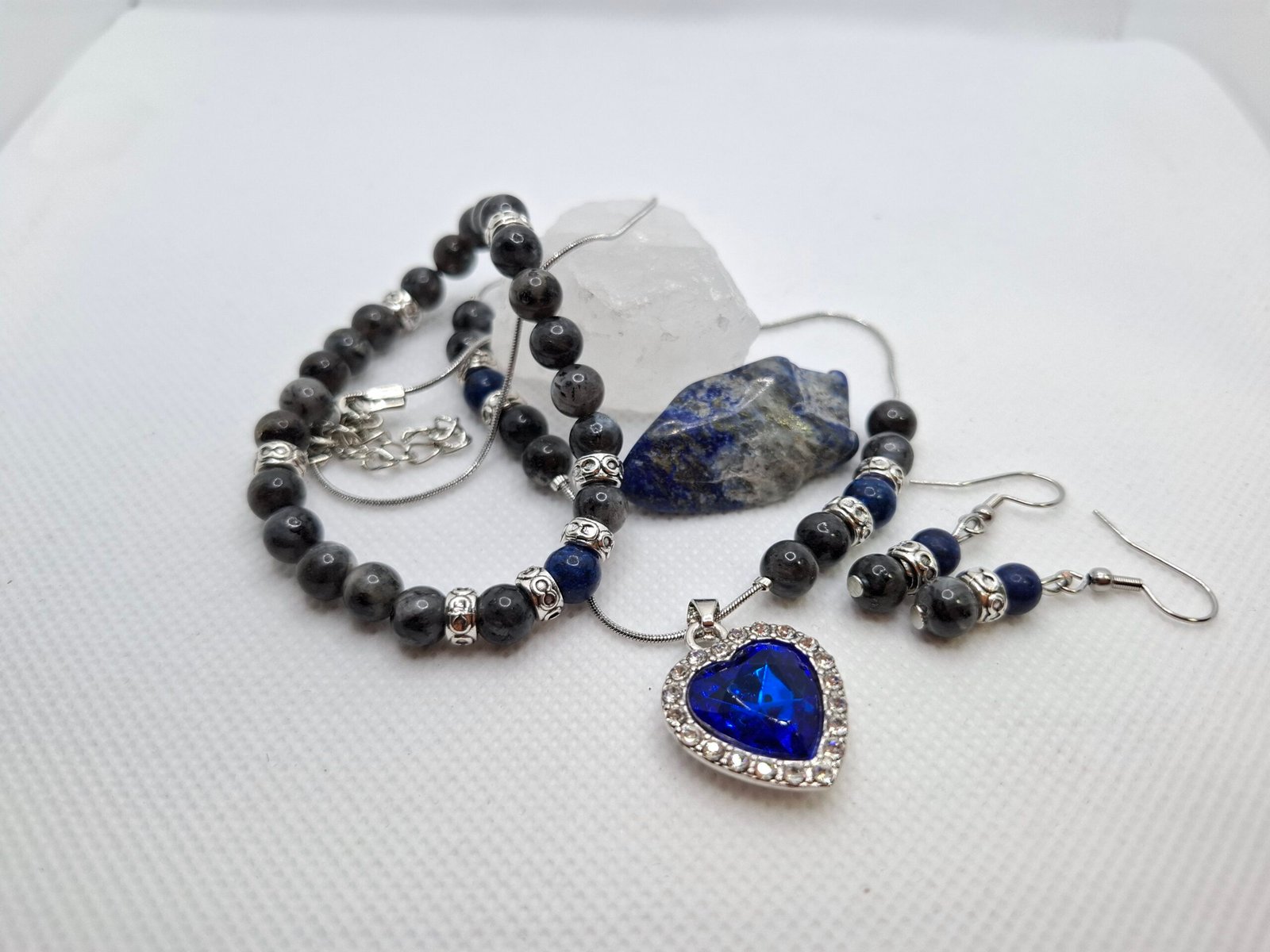 סט אלגנטי עם נוכחות יוקרתית: שרשרת, עגילים תואמים וצמיד אלסטי בעיצוב הרמוני ומוקפד. משולבים בו אבני לרוויקייט לצד לפיס לזולי, עם אלמנטים כסופים שמשלימים את המראה הנקי והאלגנטי. במרכז הסט בולט תליון לב כחול מהודר, משובץ במסגרת מנצנצת שמוסיפה ברק מדויק.