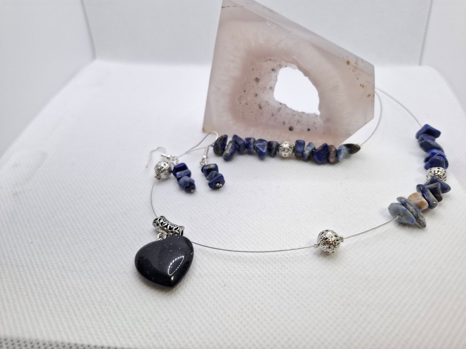 סט תכשיטים מהפנט המשלב את העומק המלכותי של לפיס לזולי עם הנצנוץ הקוסמי של בלו סנדסטון. השרשרת כוללת תליון לב כחול כהה מנצנץ, עגילים תואמים ושילוב חרוזים בגווני כחול עמוק וכסף, היוצרים מראה מסתורי, אלגנטי ומלא נוכחות.