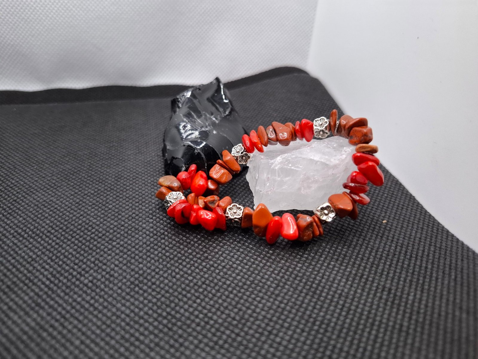 הקורל מביא אנרגיה של שמחת חיים, תשוקה וחיבור ללב הפועם, בעוד הג׳ספר האדום מעניק קרקוע, יציבות ואומץ לפעול מתוך ביטחון פנימי.