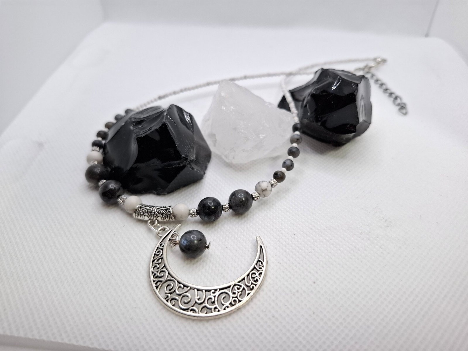 שרשרת "שקט ירחי" – שרשרת בעלת נוכחות שקטה המשלבת לרוויקייט בגווני אפור עמוקים, אבן של הגנה וחידוד מודעות, יחד עם היולייט הלבן לאיזון, ניקוי מנטלי ורוגע פנימי.