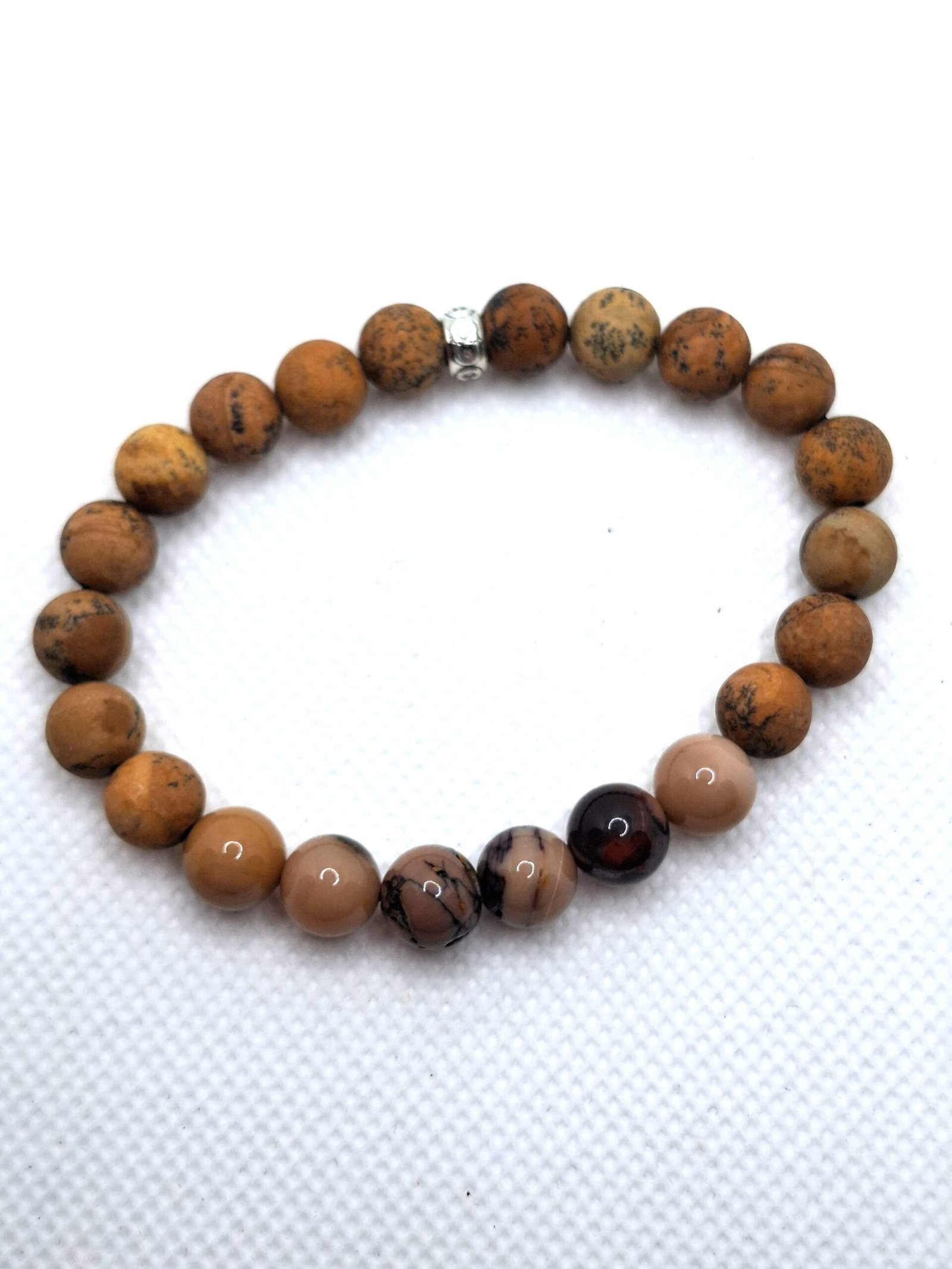 צמיד מאבני ג׳ספר פיקצ׳ר ומוקייט טבעיות – אבנים של קרקוע, יציבות וחיבור לדרך האישית.